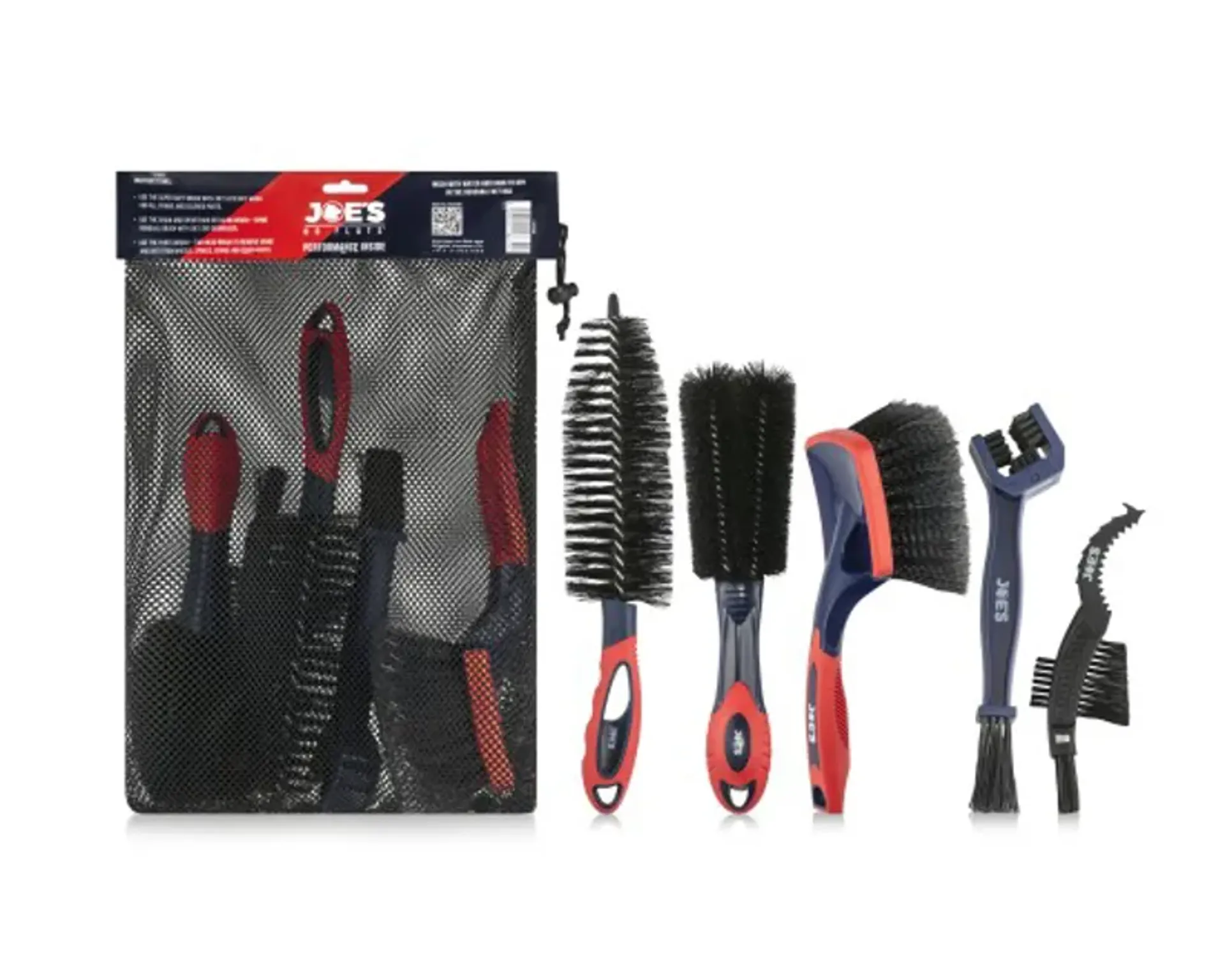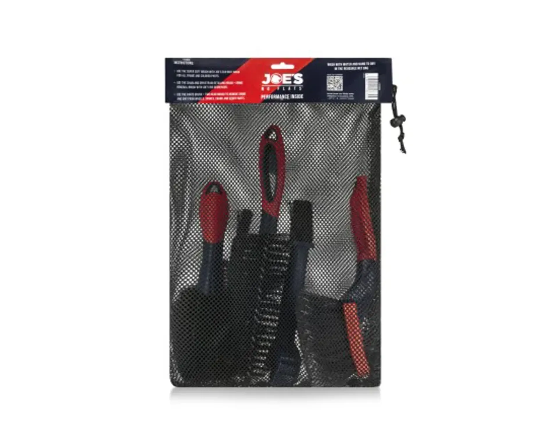 The brushes feature comfortable ergonomic handles for ease of use. The set also comes with a reusable dry and storage bag for convenience. These brushes are intended for use with Joe's No Flats cleaning line.